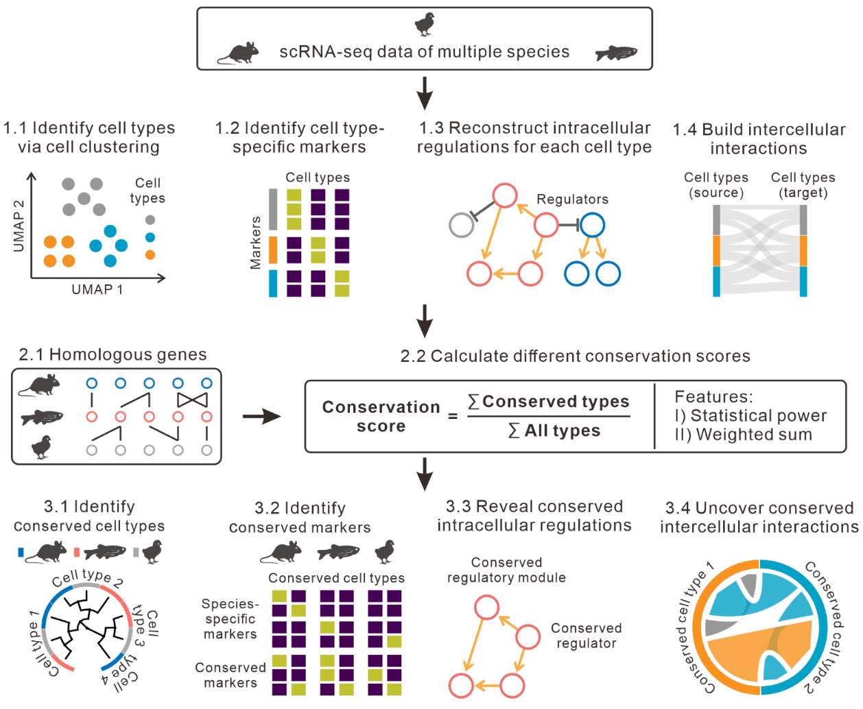 物種不僅在基因?qū)用?,也在?xì)胞類型、基因表達(dá)、基因調(diào)控、細(xì)胞間相互作用等方面顯示出進(jìn)化保守性。單細(xì)胞轉(zhuǎn)錄組測序技術(shù)已廣泛用于不同物種的單細(xì)胞表達(dá)研究,為在細(xì)胞類型水平研究物種的進(jìn)化保守性提供了新機(jī)會。已有的算法能通過分析跨物種單細(xì)胞轉(zhuǎn)錄組數(shù)據(jù)識別進(jìn)化保守的細(xì)胞類型,如Seurat和SAMap等。但是,這些方法主要通過跨物種的單細(xì)胞聚類確定保守細(xì)胞類型,其準(zhǔn)確性在很大程度上取決于跨物種批次效應(yīng)校正的能力。這些軟件對進(jìn)化距離較遠(yuǎn)物種進(jìn)行聚類分析,仍存在明顯不足。此外,目前仍沒有方法能確定細(xì)胞間相互作用的進(jìn)化保守性。
