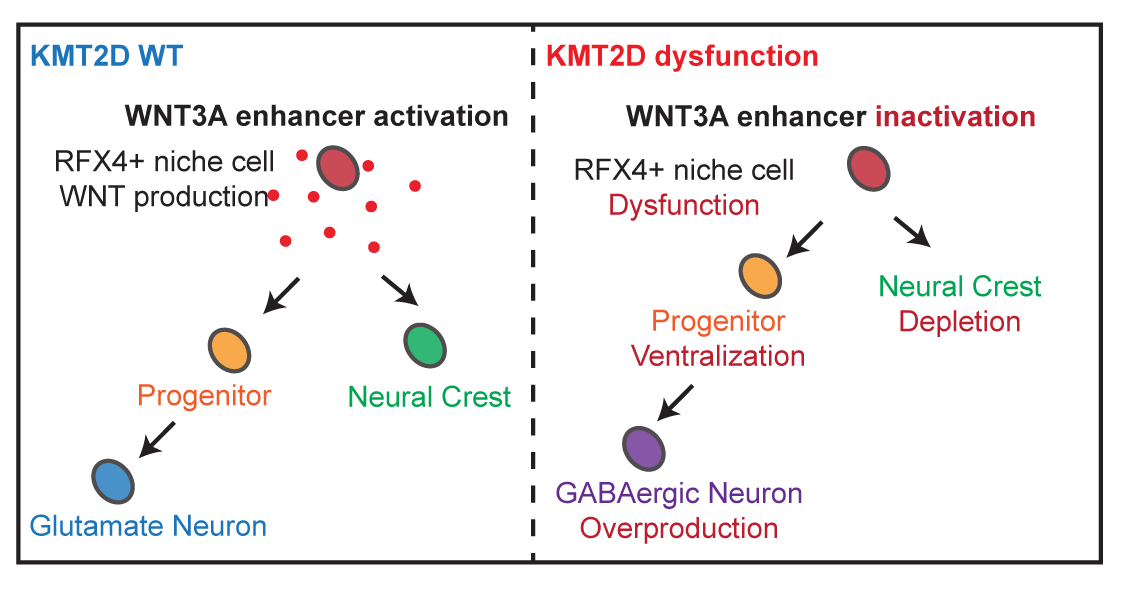 研究團(tuán)隊(duì)利用人胚胎干細(xì)胞以及KABUKI綜合征患者家系iPS細(xì)胞,建立含神經(jīng)嵴的類腦器官分化模型。研究發(fā)現(xiàn)KMT2D失活后,Roof plate樣細(xì)胞無(wú)法正常激活WNT3A的核心增強(qiáng)子,微環(huán)境WNT信號(hào)活性不足,從而導(dǎo)致神經(jīng)干細(xì)胞提前分化且異常傾向抑制性神經(jīng)元譜系方向,同時(shí)導(dǎo)致神經(jīng)嵴譜系分化障礙;進(jìn)一步通過(guò)WNT3A增強(qiáng)子敲除的人胚胎干細(xì)胞模型和?Kmt2d?突變小鼠模型驗(yàn)證了這一結(jié)論,同時(shí)在KMT2D-KO類腦器官的分化培養(yǎng)中添加WNT信號(hào)通路激動(dòng)劑或WNT3A蛋白,成功在類器官水平上挽救了該疾病表型。