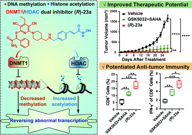 在該研究中,團隊通過融合DNMT1和HDAC抑制劑的關(guān)鍵藥效基團,獲得了一系列DNMT1/HDAC雙效抑制劑。其中,化合物(R)-23a在體外和細胞中對DNMT1和Class-I HDAC表現(xiàn)出有效的“在靶”抑制活性,從而逆轉(zhuǎn)腫瘤特異性DNA高甲基化和組蛋白低乙?;?。與DNMT1或HDAC單靶點抑制劑相比,化合物(R)-23a引起更為顯著的轉(zhuǎn)錄組變化,包括激活多個表觀遺傳沉默的抑癌基因和下調(diào)關(guān)鍵致癌基因。在抗腫瘤活性和安全性方面,DNMT1/HDAC雙效抑制劑(R)-23a可通過直接殺傷腫瘤細胞,或重編程腫瘤免疫微環(huán)境,進而誘導(dǎo)實體腫瘤的消退,其抗腫瘤活性和安全性優(yōu)于單一靶點藥物聯(lián)用。