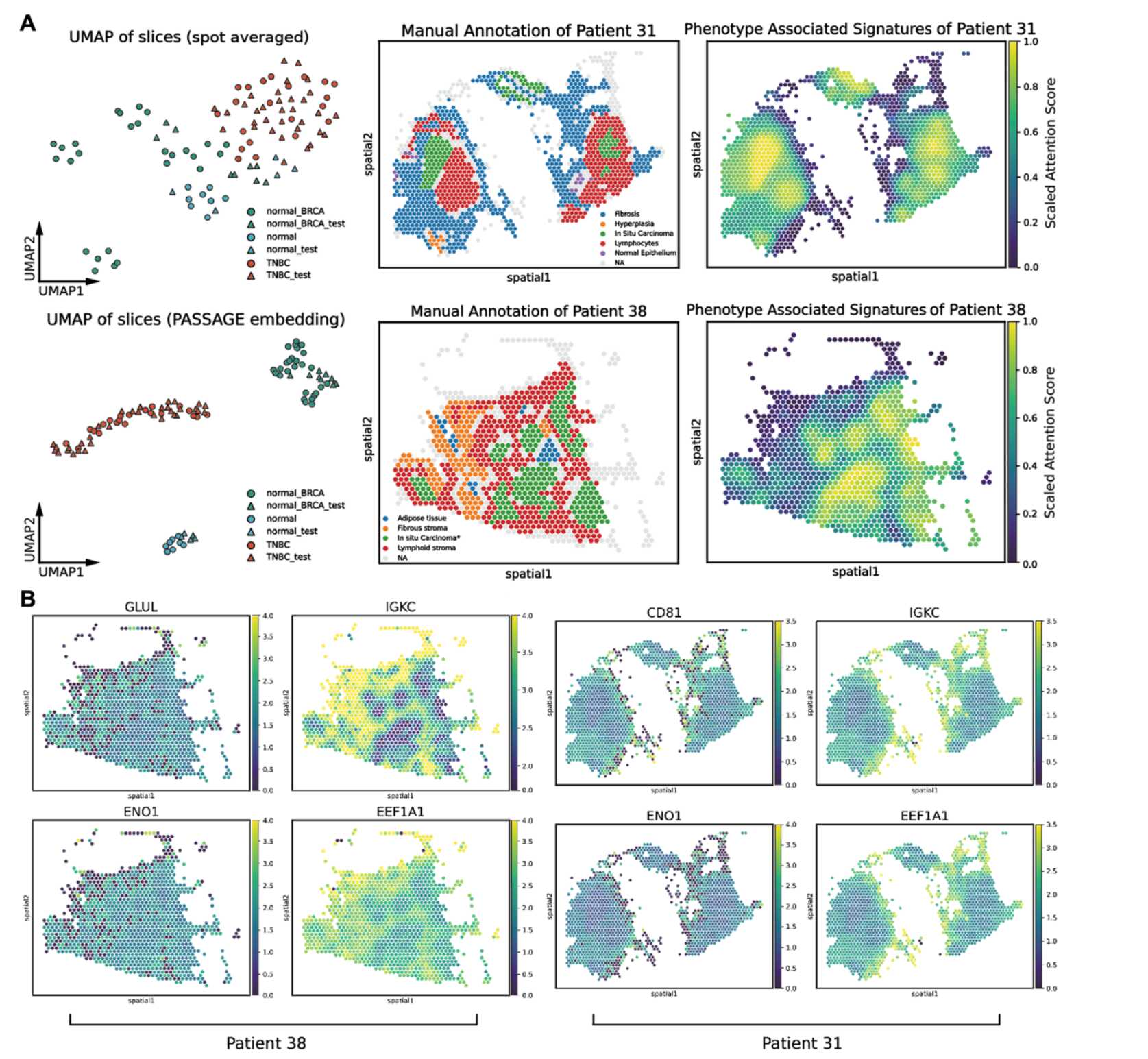 圖2 ?A) PASSAGE在乳腺癌案例中成功學(xué)習(xí)到良好的切片級(jí)表征與所識(shí)別的表型關(guān)聯(lián)空間特征?B) PASSAGE在乳腺癌案例中成功學(xué)習(xí)到與表型關(guān)聯(lián)空間特征高度關(guān)聯(lián)的基因集