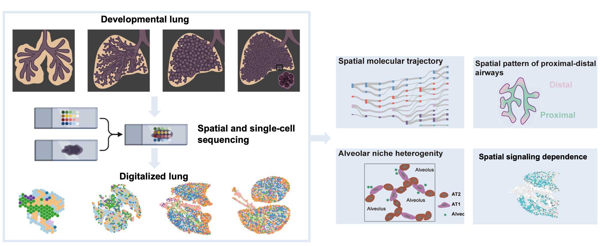 分子軌跡、近端和遠(yuǎn)端氣道發(fā)育的空間模式、肺泡發(fā)育的生態(tài)位異質(zhì)性和肺發(fā)育中的信號通路調(diào)控。