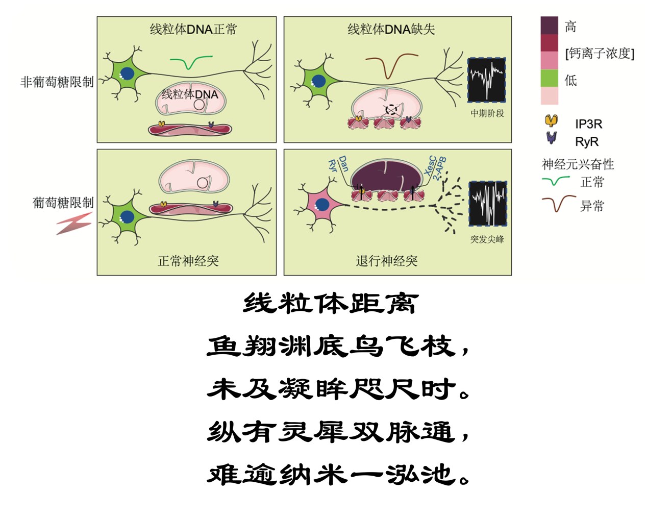 “世界上最遙遠的距離,是飛鳥與魚的距離,一個翱翔天際,一個卻深潛海底”,世界上最遙遠的距離不是飛鳥與魚的距離,是線粒體與內質網的距離。正是“魚翔淵底鳥飛枝,未及凝眸咫尺時”!內質網-線粒體接觸的距離20nm,通過兩個通道RyR、IP3R把鈣離子從內質網傳給線粒體,調控能量的產生;而接觸距離的異??s短,使鈣轉運失控過載驅動神經元退行,正是“縱有靈犀雙脈通,難逾納米一泓池”。 世界上最遠的距離,是這樣向死而生的情非得已。