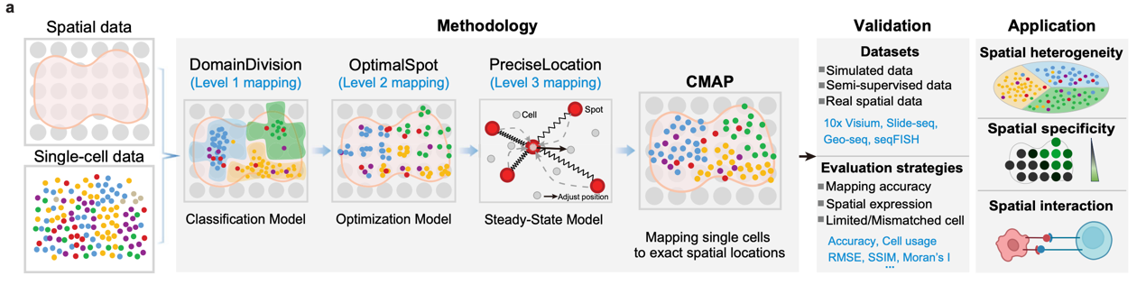 針對這一問題,研究團(tuán)隊提出了CMAP(Cellular Mapping of Attributes with Position)計算模型,通過整合單細(xì)胞和空間轉(zhuǎn)錄組數(shù)據(jù),采用“分治”策略,實現(xiàn)大規(guī)模單細(xì)胞向空間位置的高精度映射。