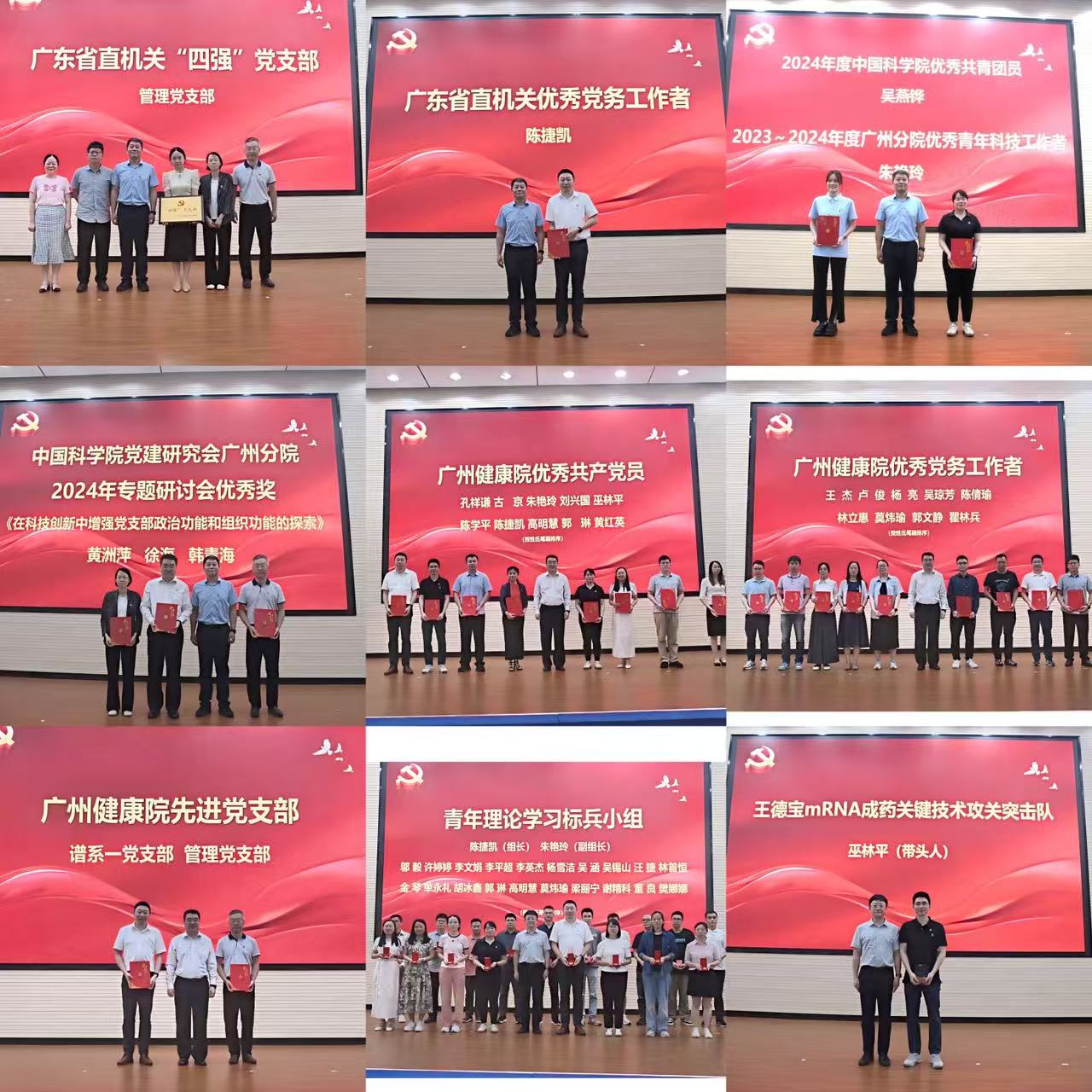 報(bào)告后,大會(huì)舉行新黨員入黨宣誓儀式,全體黨員重溫入黨誓詞。會(huì)議表彰了省直機(jī)關(guān)“四強(qiáng)”黨支部、優(yōu)秀黨務(wù)工作者、中國(guó)科學(xué)院優(yōu)秀共青團(tuán)員和廣州分院優(yōu)秀青年科技工作者、廣州健康院“兩優(yōu)一先”等先進(jìn)個(gè)人與集體,并為青年理論學(xué)習(xí)標(biāo)兵小組授章。為激勵(lì)科研尖兵勇闖“無(wú)人區(qū)”,會(huì)上為新成立的王德寶mRNA成藥關(guān)鍵技術(shù)攻關(guān)突擊隊(duì)授牌。