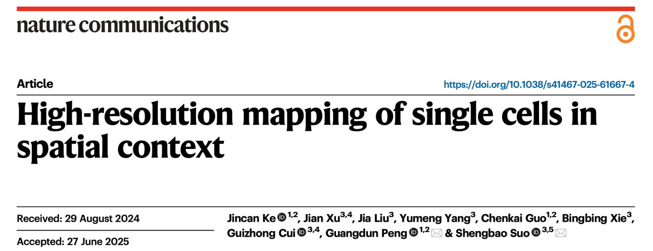 2025年7月15日,中國科學(xué)院廣州生物醫(yī)藥與健康研究院彭廣敦課題組和廣州國家實驗室索生寶課題組合作,在Nature Communications上發(fā)表了題為High-resolution mapping of single cells in spatial context的研究論文。