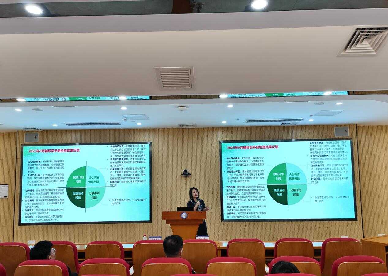 隨后,教育處負(fù)責(zé)人鄭小潔通報(bào)《輔導(dǎo)員工作手冊(cè)》核查情況,明確記錄規(guī)范并提出改進(jìn)建議,分享學(xué)生思政及心理健康教育工作實(shí)用方法與技巧,切實(shí)推動(dòng)學(xué)生管理與心理健康工作向標(biāo)準(zhǔn)化、精細(xì)化邁進(jìn)。