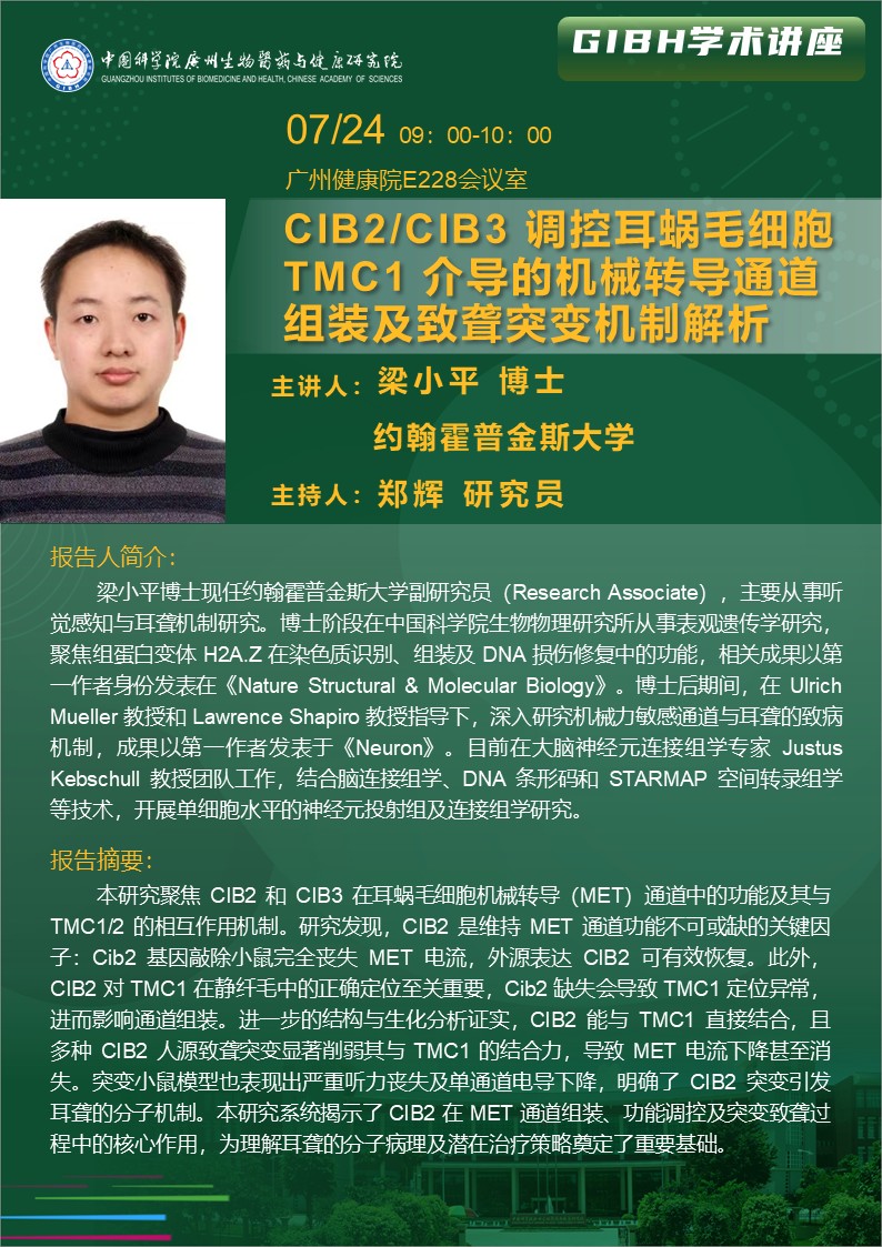 2025年7月24日講座: CIB2/CIB3 調(diào)控耳蝸毛細(xì)胞 TMC1 介導(dǎo)的機(jī)械轉(zhuǎn)導(dǎo)通道組裝及致聾突變機(jī)制解析